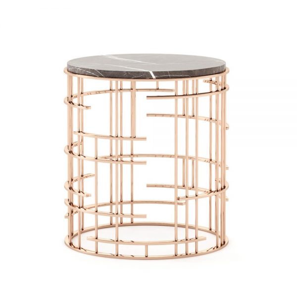This side table presents a round top and metallic structure and details. With a cylindrical shape, the asymmetrical line structure will be the highlight of your project.