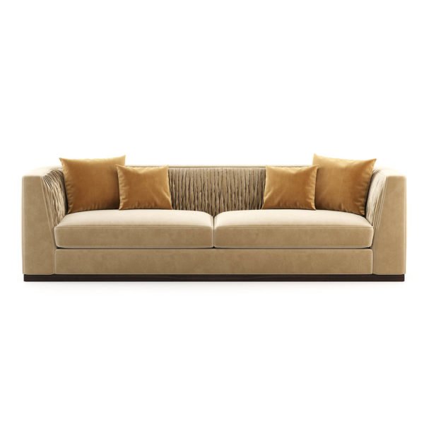 A gray living room sofa with a velvety touch and roud corners, great for a contemporary interior decor. This stunning piece can go along with metallic pillows or a bold color rug.