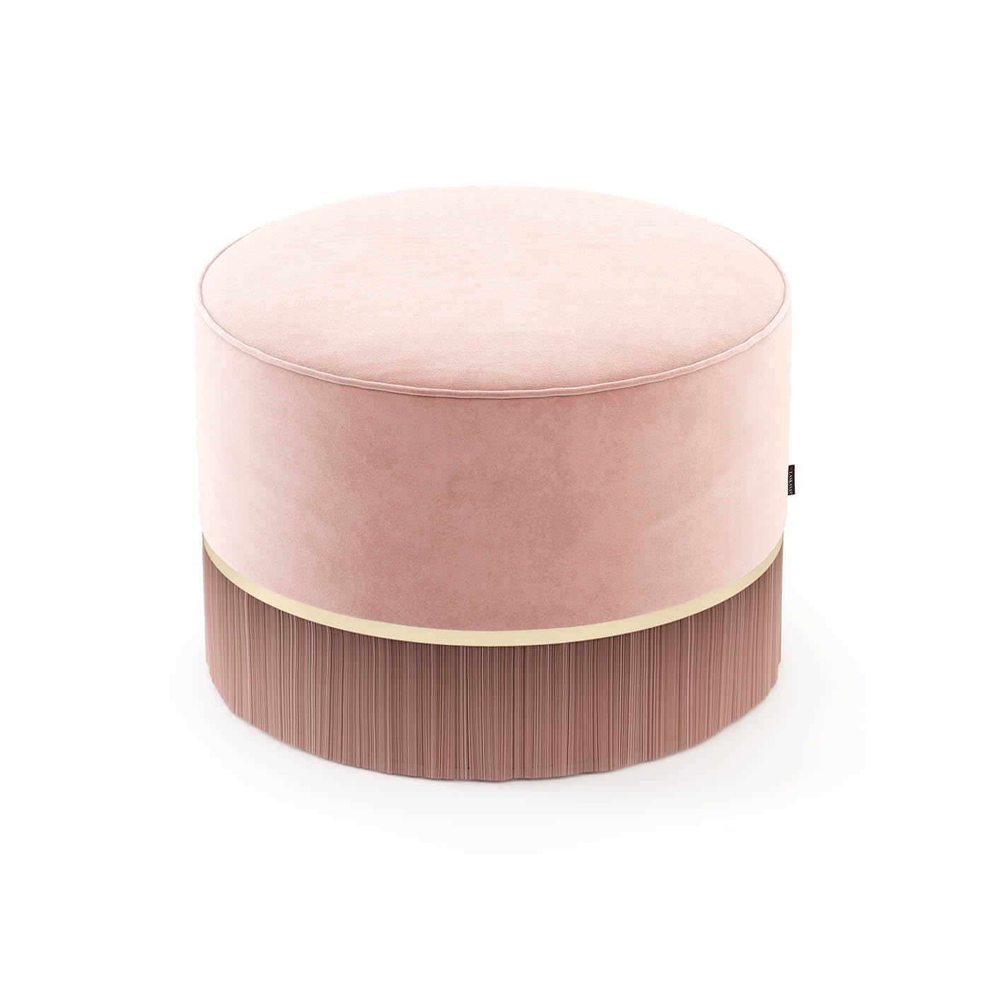 A circular upholstered piece in two sections, with a metal border separating the smooth upholstery from the fringed section, creating a feminine and pleasing design.