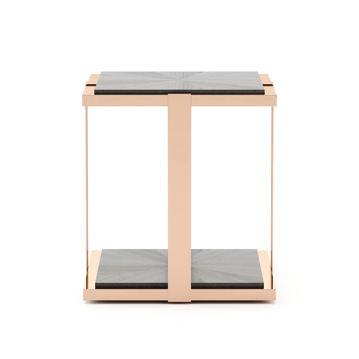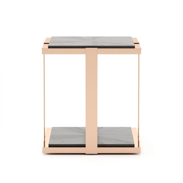 Tracy side table is a wooden design with a metallic structure. Both the base and the upper part present an elegant selection of finishes and materials, which contrast with the rough feet.